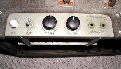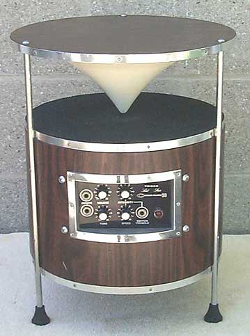 solid state amp,14" round x 18" tall, 8 watt output/ 6" speaker, power "on" light, volume control/ on-off switch, 2 input jacks, tone control, external switched speaker output jack on bottom, tremolo footswitch jack for use with the tremolo section speed and intensity adjustment controls, vertically mounted upward facing speaker with an omni-directional baffle cone for 360 degree sound projection.