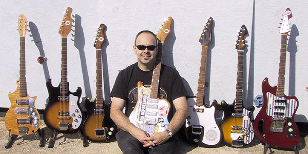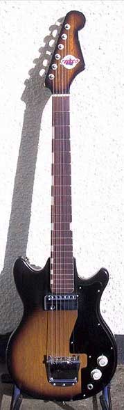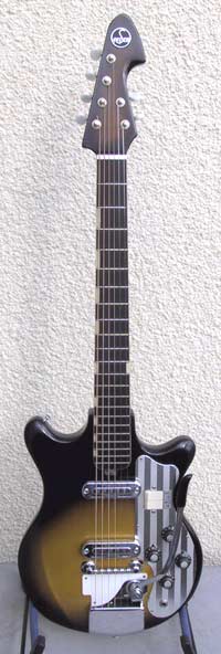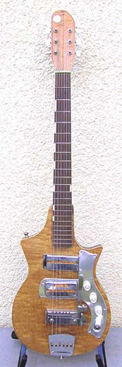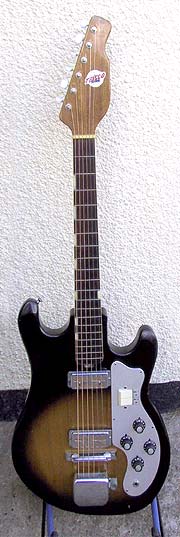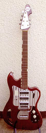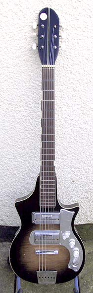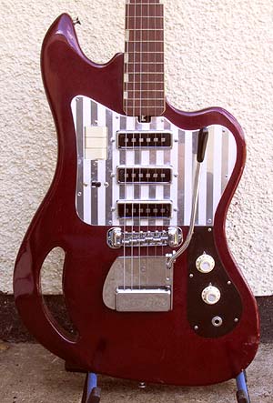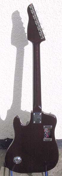 A chunky workhorse, this one! Not one of Teisco's prettiest but boy do those pickups burn! Note the ugly 'Bizzaro' squared-off headstock - typical of the period. Another eBay bargain, it came with replacement metal tuners but I managed to find some original plastic ones and restored it. Thanks to Dawn Wyatt in Westminster, Maryland, USA.